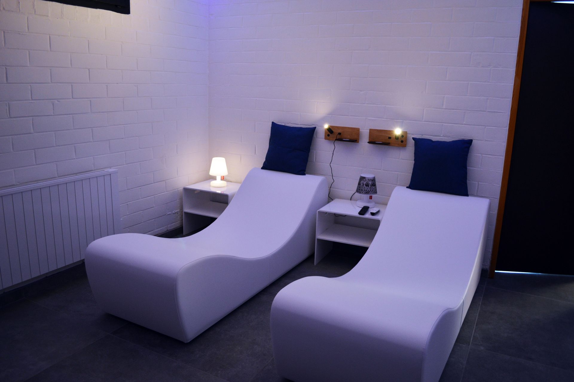 Entre chaque voyage sensoriel, ou à la fin de ceux-ci, profitez de cet espace cosy équipé de fauteuils de relaxation et d’un écran de projection